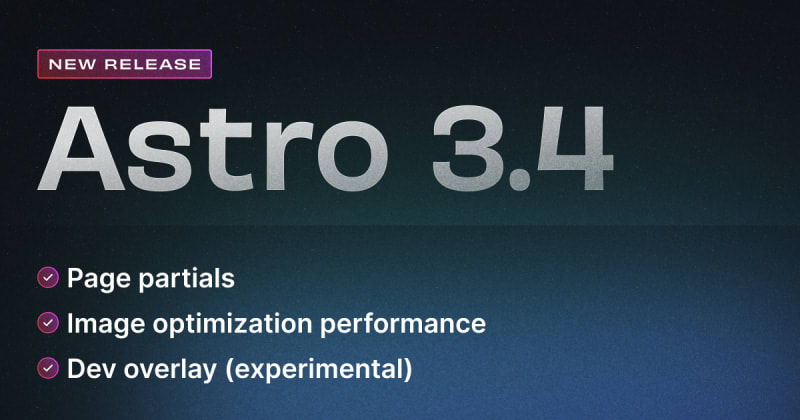 Astro 3.4 introduces page partials, optimized image generation, and a new experimental dev overlay. It also includes bug fixes and improvements.