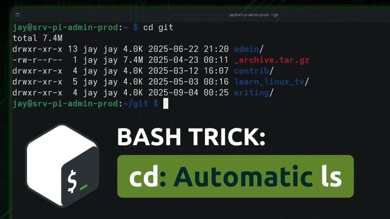 A simple Bash customization that automatically runs `ls` after every `cd` command by overriding `cd` in `.bashrc` with a custom function. The function uses `builtin cd` to avoid recursion, supports a fallback to `$HOME`, and runs a colorized `ls -lh -F` listing. A bonus `extract` function is also covered, which auto-detects