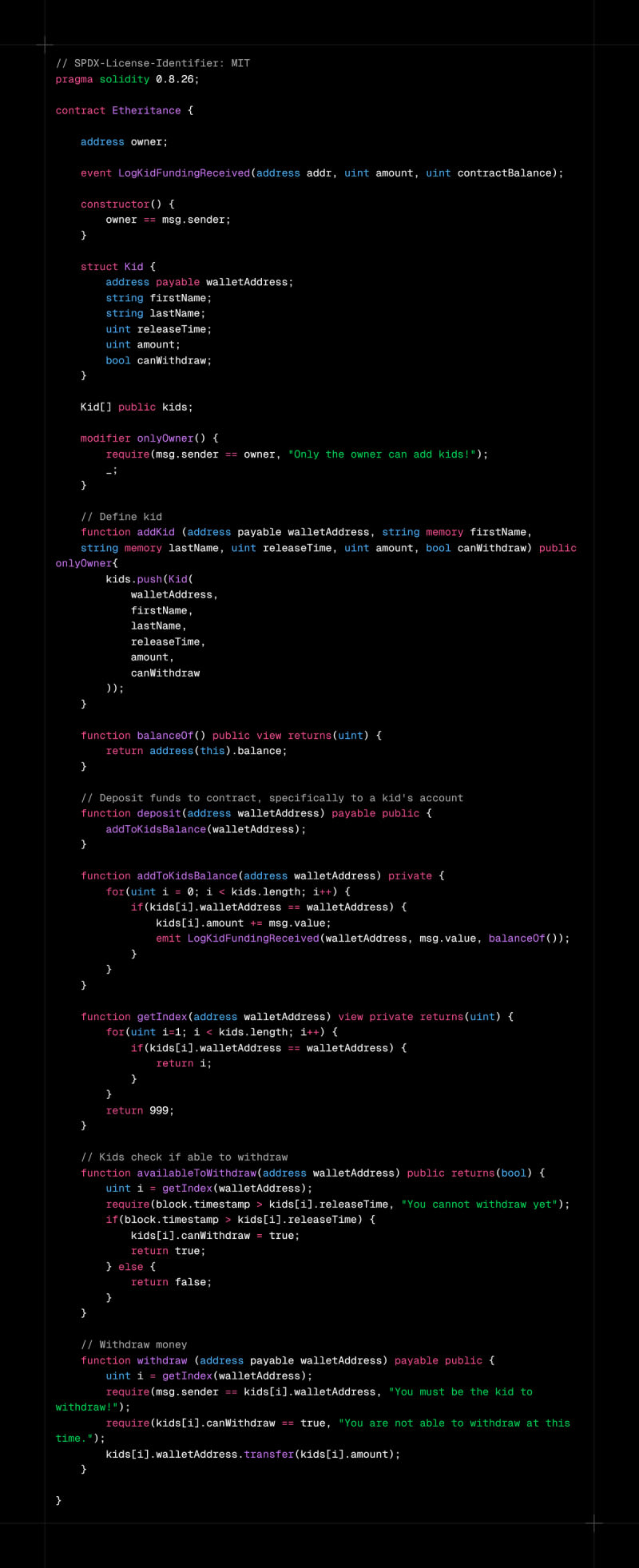 Etheritance is a Solidity-based smart contract on the Ethereum blockchain designed to automate and secure the inheritance process. The contract allows parents or guardians to set conditions under which beneficiaries can withdraw funds, ensuring transparency and security. Key features include automated funds distribution,