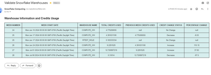 Efficient management of Snowflake resources can be optimized by automating warehouse usage reports. This involves creating a stored procedure in Snowflake to gather and format usage data into an HTML email, and scheduling the procedure to run weekly using Snowflake Tasks. Benefits include automation, improved efficiency in