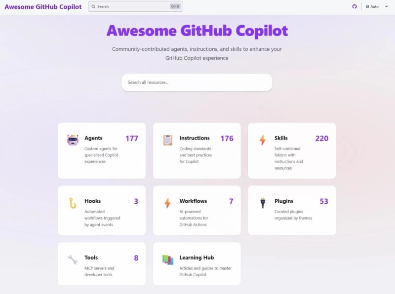 The Awesome GitHub Copilot community repo has grown to 600+ resources including 175+ agents, 208+ skills, 176+ instructions, and 48+ plugins. Microsoft is launching a dedicated website at awesome-copilot.github.com with full-text search, modal previews, and one-click VS Code installs. A new Learning Hub explains core
