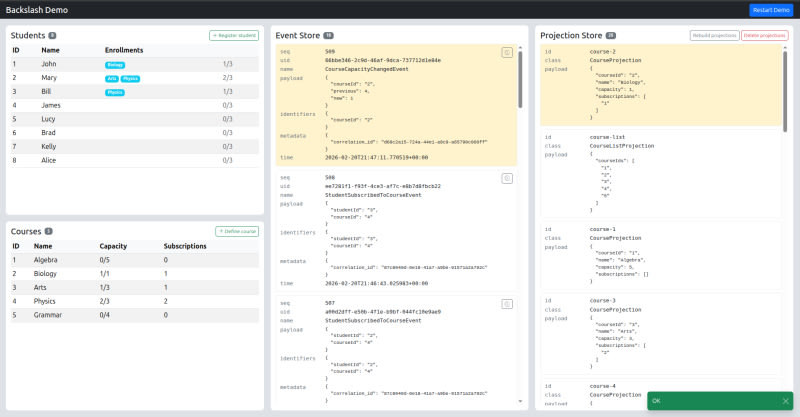 Event sourcing is often overlooked #The best way to learn is to build #What Backslash is #Ten years in production #A recent evolution: Dynamic Consistency Boundary #The Missing Demo Application #Sort: