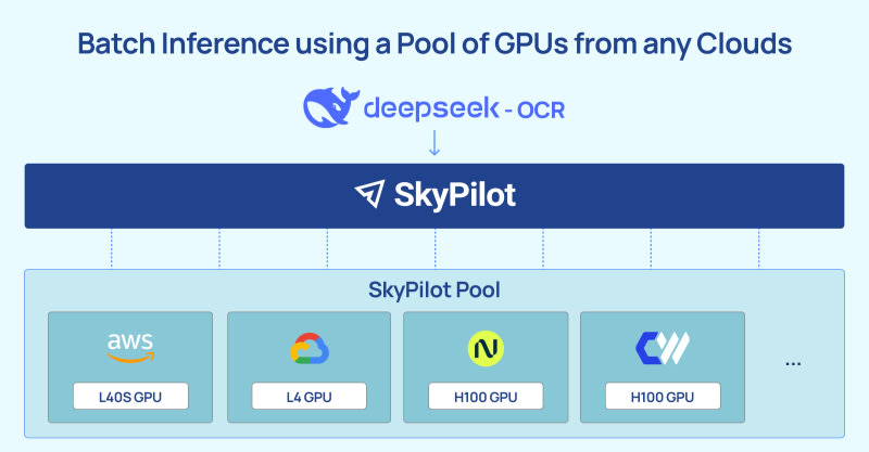 DeepSeek-OCR processes scanned documents and legacy PDFs into clean markdown for RAG systems, but single-GPU processing is too slow for enterprise archives. SkyPilot Pools enables parallel batch inference across multiple clouds and Kubernetes clusters by creating a unified pool of GPU workers that stay warm and ready. Workers