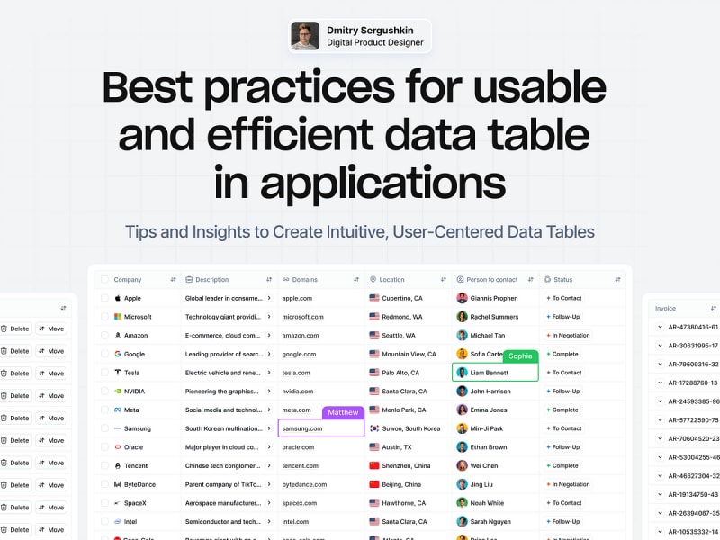 Creating effective data tables involves thoughtful UX design, clear organization, and practical features like search functionality, manual column adjustments, bulk actions, and customizable views. These best practices enhance usability, improve data accessibility, and streamline user interactions, ensuring tables are functional, accessible, and user-friendly.