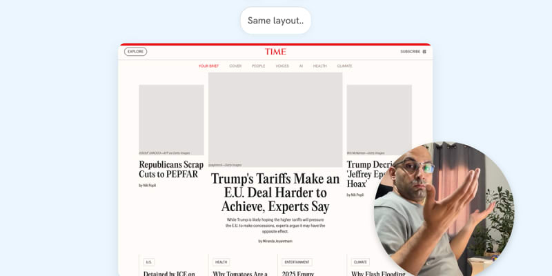 A detailed analysis of Time.com's hero section layout, demonstrating how to rebuild it using modern CSS techniques. The article covers CSS Grid, container queries, the :has() selector, and grid areas to create flexible, responsive layouts that adapt based on content and viewport size. Key techniques include using display:
