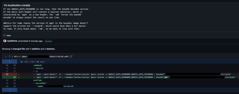 A bug related to base64 encoded strings in a cronjob using wget to call an endpoint is fixed by specifying a flag to force the output of base64 on the same line.