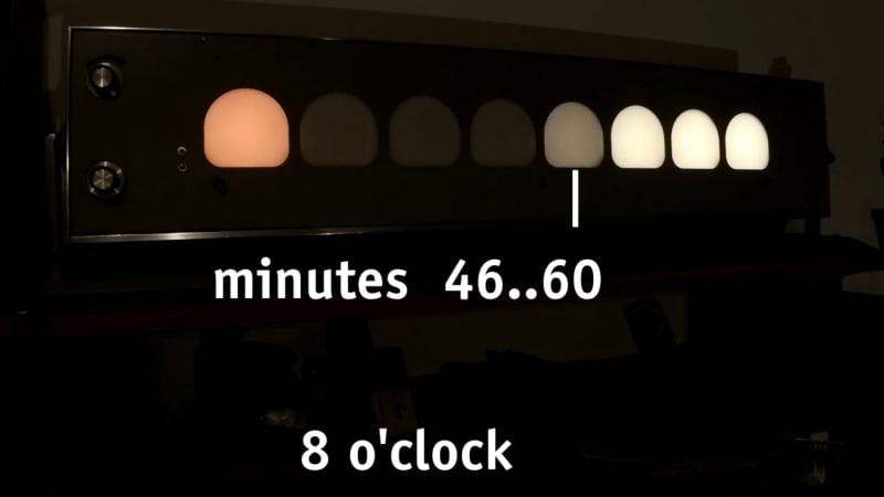 A binary clock design combines traditional binary counting for hours with a visual gradient display for minute progression. The creator corrected for human perception by implementing a logarithmic curve to compensate for how the eye perceives brightness gradients, making the display more accurate and usable than standard linear gradients.