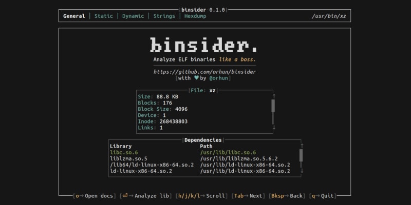 Binsider is a tool for inspecting ELF binaries, offering both static and dynamic analysis capabilities similar to readelf and strace. It allows users to examine strings, linked libraries, and perform hexdumps within a user-friendly text-based user interface (TUI).