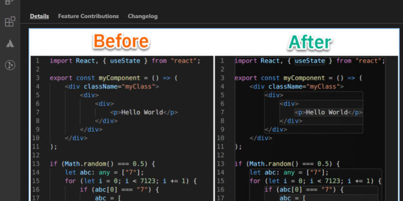 VSCode extension - Blockman. You can customize block colors, depth, turn on-off focus, curly/square/round brackets, and more.Supports Python, Dart, Rust, Swift, R, Go, PHP, JavaScript, JSX, TypeScript, TSX, C, C#, C++, Java, HTML, CSS and more...