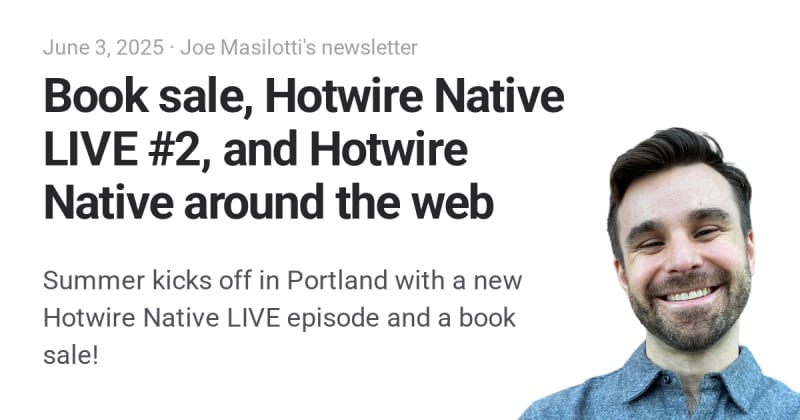 Joe Masilotti's newsletter highlights the second Hotwire Native LIVE episode focusing on bridge components, a 40% discount on his Hotwire Native book through Pragmatic Bookshelf's spring sale, and community articles covering seamless loading techniques and custom Android keyboard extensions for Hotwire Native apps.