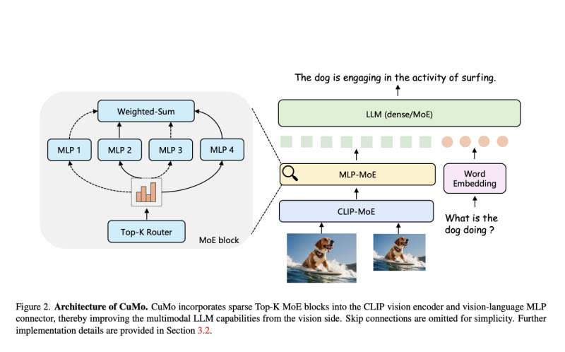 Scaling multimodal AI with CuMo, a method that integrates sparse MoE blocks into multimodal language models (LLMs) for efficient scaling while maintaining performance. The approach employs co-upcycling and a three-stage training process, resulting in impressive performance on visual question-answering benchmarks and multimodal reasoning challenges.