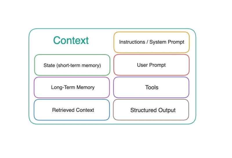 Context Engineering is the practice of providing minimal, focused context to AI agents at each step of their execution. The article breaks down six types of context that need management: system prompts, user prompts, retrieved context, short-term memory, long-term memory, tools, and structured output. Each type presents unique