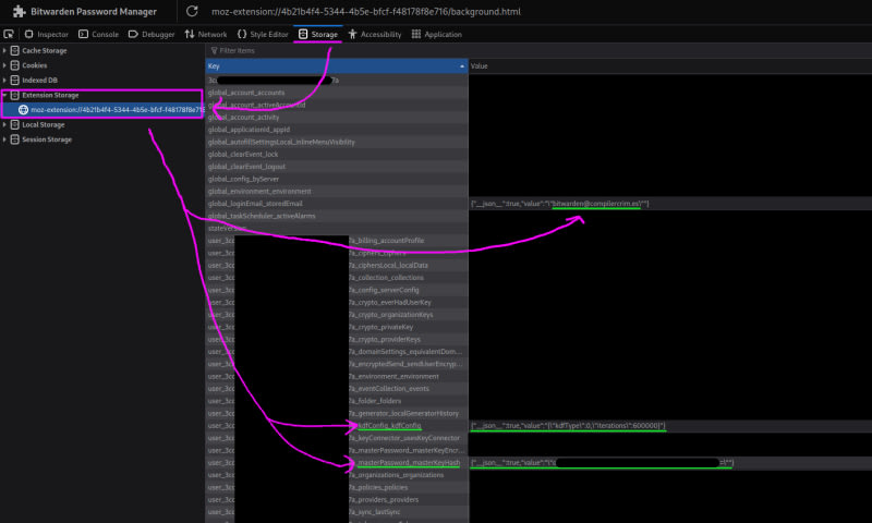 A developer forgot one word of their Bitwarden master passphrase and documented how they recovered it via local brute-force. Since the vault was locked but not logged out, they inspected the Firefox extension's storage via about:debugging to extract the email (used as salt), kdfConfig, and masterPassword_masterKeyHash. They