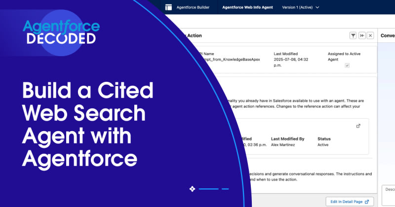Learn how to build an AI agent using Salesforce's Agentforce that performs web searches and provides cited answers. The tutorial covers setting up prompt templates in Prompt Builder, creating Apex classes that connect to the Connect API, and configuring agent topics to handle web information retrieval with proper citations.