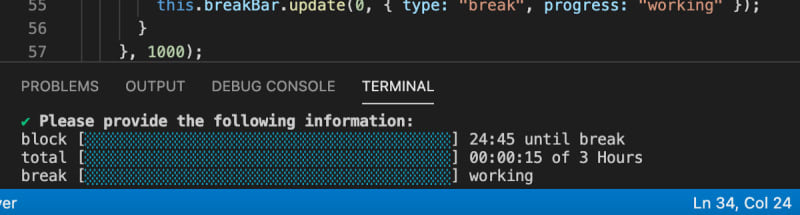 Build a Command-Line Pomodoro Timer in Node.js.Tracks progress towards completing a given number of hours of work.Sets goals for continuous work block and break lengths.Emits logs for analysis at a future date. Classes vs. Functional.
