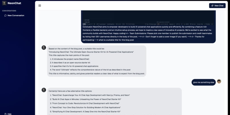 NeonChat is an open-source starter kit designed to simplify the building of AI chat applications. It integrates Next.js, Prisma, and Neon's serverless Postgres to offer a scalable, flexible, and developer-friendly solution. Key features include a clean chat interface, real-time AI chatting, and easy conversation saving. A CLI
