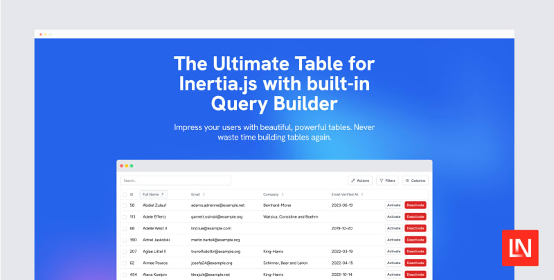 Inertia Table is part of the Inertia UI suite, designed for Laravel, Vue, and Tailwind CSS, created by Pascal Baljet. It simplifies building tables based on Eloquent Models with features like sorting, pagination, column toggles, search, extensive filtering, and export options (CSV, Excel, PDF). It supports dark mode and inline