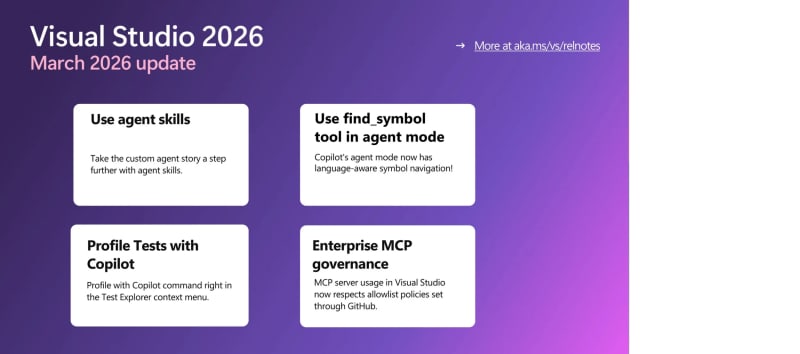 Visual Studio's March 2026 update introduces several GitHub Copilot enhancements. Custom agents can now be defined as `.agent.md` files in your repository, letting teams build specialized Copilot agents with access to workspace tools, preferred models, and MCP connections. Agent skills provide reusable instruction sets picked
