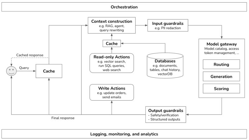 The post details the construction of a generative AI platform, highlighting the common components such as context enhancement, guardrails, model routers, gateways, and caching techniques. It explores the complexities of context construction through retrieval-augmented generation (RAG) and the necessity of guardrails for input