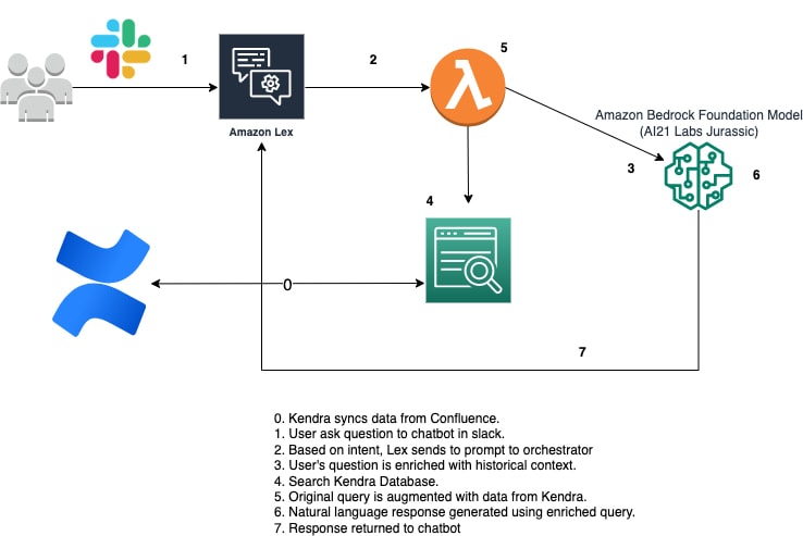 What is Amazon Lex?What is Amazon Kendra?What is Amazon Bedrock?Building the BotIndex your Confluence content using the new Confluence connector V2 for Amazon Kendra | Amazon Web…GitHub - aws-samples/amazon-bedrock-kendra-lex-chatbot: The repository offers a base implementation…Add apps to your Slack workspaceNext Steps:Sort: