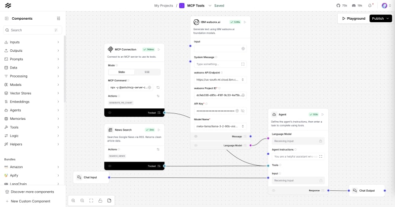 Langflow is an open-source visual tool for building agentic applications using reusable UI components and Python code. The tutorial demonstrates creating an agent that uses watsonx.ai LLM to search news and generate charts by integrating MCP (Model Context Protocol) tools. It shows how to set up custom components, connect MCP