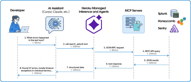 Heroku Managed Inference and Agents integrates observability platforms (Splunk, Honeycomb, Sentry) directly into your IDE using the Model Context Protocol (MCP). Instead of context-switching between dashboards during incidents, developers can query production logs, errors, and metrics using natural language from their code