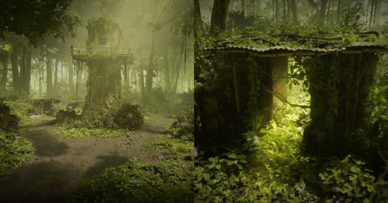 A 3D Environment Artist at Sony Bluepoint Games shares a detailed breakdown of creating an abandoned treehouse scene in 2 weeks. The workflow covers AI-generated concept art for initial inspiration, blockout and kitbashing techniques in Blender, trim sheet texturing, PCG-based vine generation in Unreal Engine 5.7.1, foliage