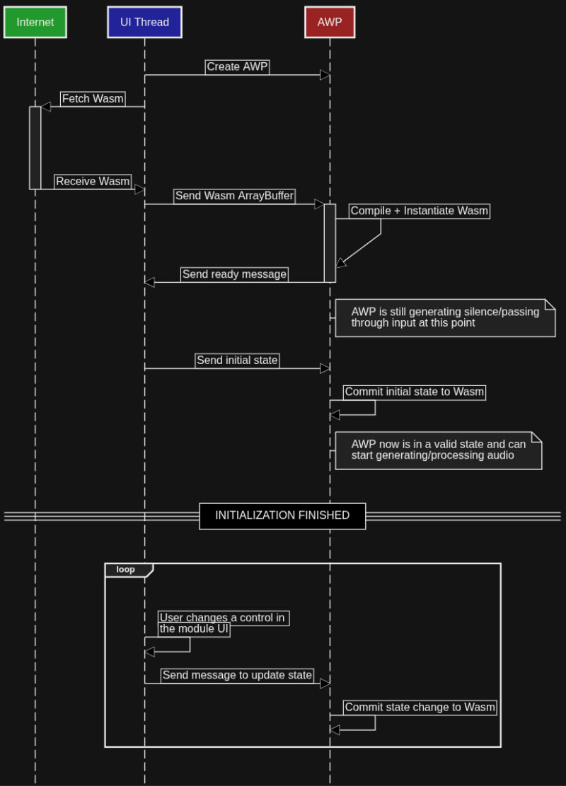 A deep dive into the architecture patterns used to build modular audio nodes for a browser-based DAW called Web Synth. Covers the core module interface (connectables, serialization, UI rendering), how AudioWorkletProcessors are used for real-time DSP with Rust/Wasm, the async initialization sequence for loading Wasm onto the