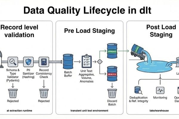 A comprehensive guide to building production-ready data pipelines in Microsoft Fabric using dltHub (dlt), addressing the platform's lack of a built-in data quality engine. Covers a six-stage data quality lifecycle: source profiling, schema/contract enforcement, pre-load Write-Audit-Publish (WAP) validation, controlled lakehouse