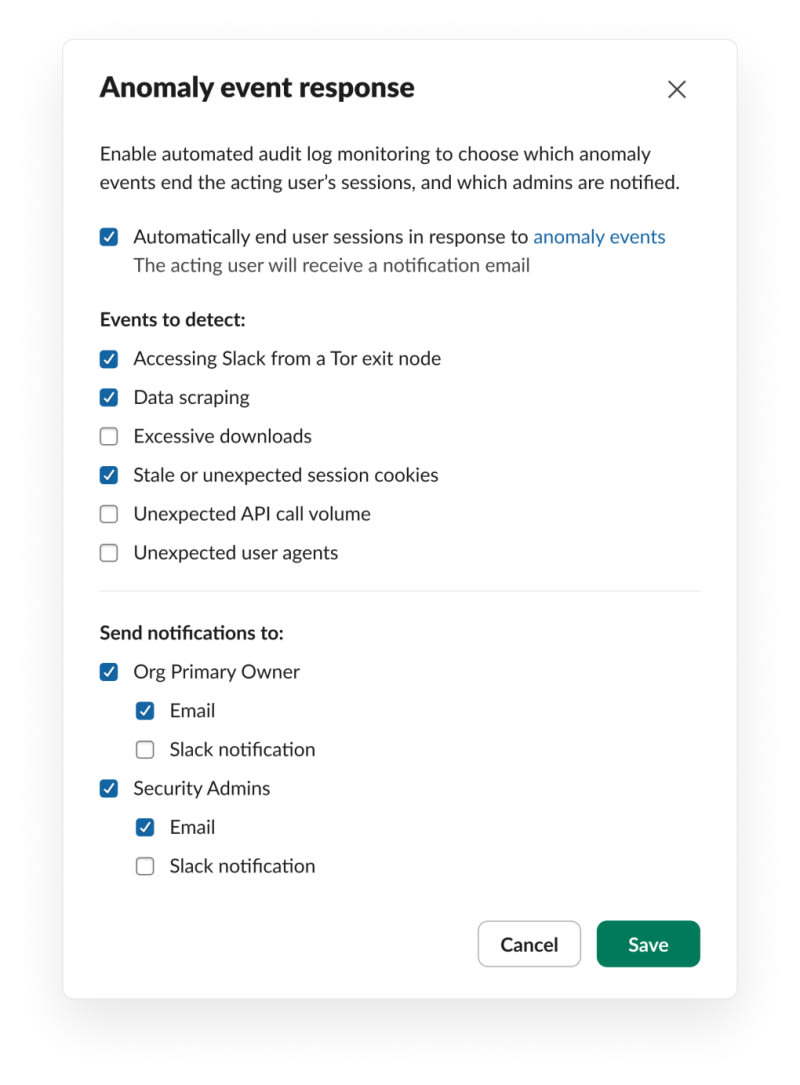Slack developed Anomaly Event Response (AER), an automated security system that detects suspicious user behavior in real-time and immediately terminates compromised sessions. The system monitors billions of daily events for threats like Tor access, excessive downloading, data scraping, and unusual API patterns. AER reduces