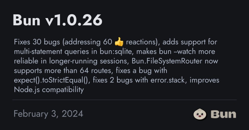 Bun is an incredibly fast JavaScript runtime, bundler, transpiler, and package manager. The latest release of Bun fixes bugs, adds new features, and improves compatibility with Node.js.