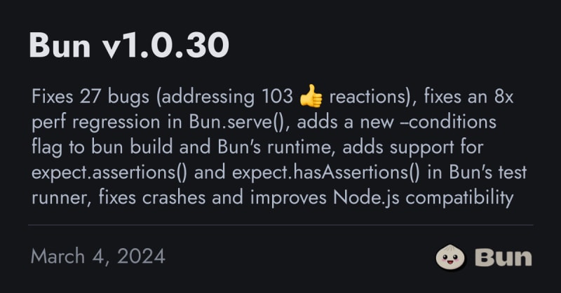 Bun v1.0.30 is a release that fixes bugs, introduces new features, and improves compatibility with Node.js. It includes an 8x performance regression fix in Bun.serve(), a new --conditions flag for bun build, and support for expect.assertions() and expect.hasAssertions() in Bun's test runner. It also fixes crashes and improves Node.js compatibility.