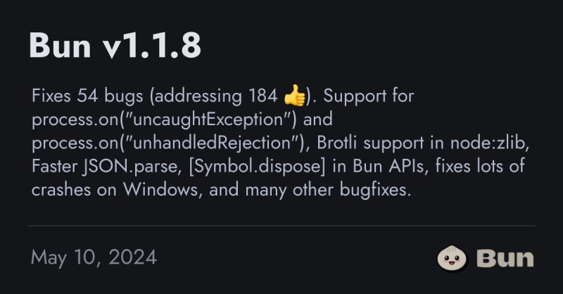 Bun v1.1.8 is released with numerous bug fixes and new features including support for process.on('uncaughtException') and process.on('unhandledRejection'), Brotli support in node:zlib, and [Symbol.dispose] in Bun APIs.
