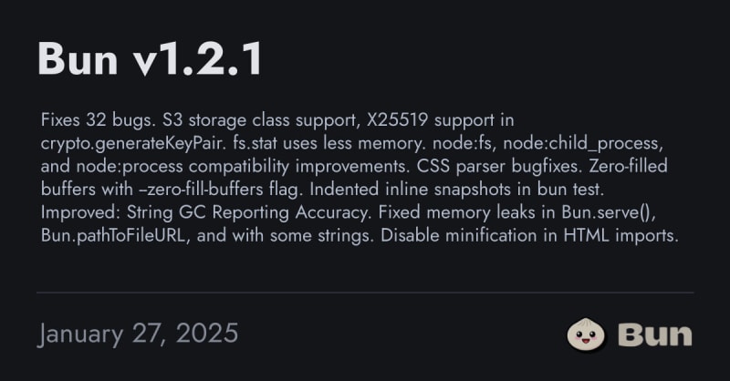 Bun v1.2.1 includes significant updates such as S3 storage class support, X25519 support in crypto.generateKeyPair, and memory leak fixes in various functions. Compatibility improvements with node:fs, node:child_process, and node:process are also included. Jest-style inline snapshots now support indentation in bun test, and the