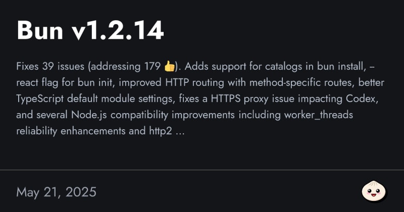 The latest Bun v1.2.14 release fixes 39 issues and introduces features like support for catalogs in bun install, a --react flag for bun init, improved HTTP routing, and enhancements in Node.js compatibility. Additionally, Bun offers better TypeScript module settings, zstd compression support, HTTPS proxy reliability,