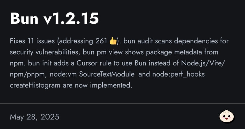 Bun v1.2.15 introduces bug fixes, security improvements with bun audit, and new features like bun pm view for package metadata. Enhancements include Node.js compatibility with vm.SourceTextModule and perf_hooks.createHistogram. The release also updates JavaScriptCore for stability and performance improvements in ECMAScript