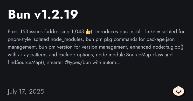 Bun v1.2.19 introduces significant improvements including isolated node_modules installation similar to pnpm, interactive package updates, package.json management commands, dependency tree analysis with `bun why`, enhanced test coverage options, VS Code Test Explorer integration, PostgreSQL client performance optimizations with