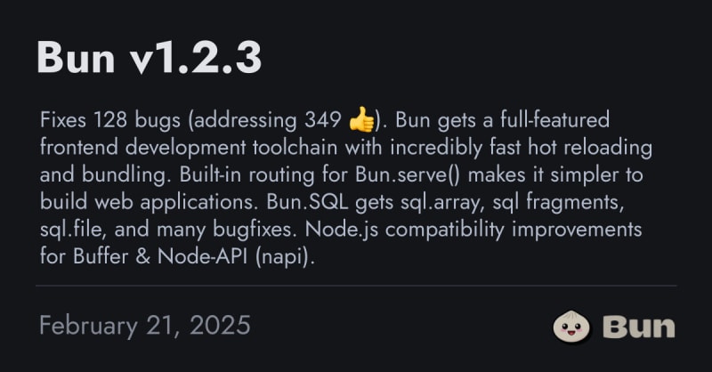 Bun v1.2.3 introduces a full-featured frontend development toolchain with fast hot reloading and bundling. It enhances Bun.serve() with built-in routing and dynamic path parameters, simplifies frontend-backend integration, and improves Node.js compatibility. Notable updates include Bun.SQL improvements, faster WebAssembly