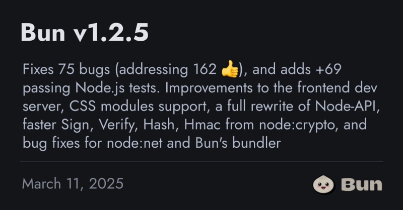 Bun v1.2.5 fixes 75 bugs, adds 69 passing Node.js tests, improves the frontend dev server, enhances CSS modules support, rewrites Node-API, and improves performance of cryptographic operations. It also introduces several compatibility fixes with Node.js, supports HMR, enhances Svelte support, and addresses various bug fixes related to timers, events, WebSockets, and more.