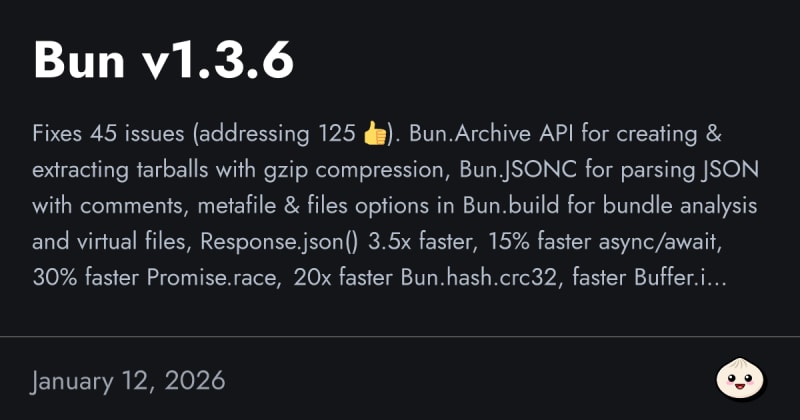 Bun v1.3.6 introduces new APIs for tarball creation/extraction (Bun.Archive) and JSONC parsing, adds metafile and virtual files support to Bun.build, and delivers significant performance improvements: Response.json() is 3.5x faster, async/await 15% faster, Promise.race 30% faster, and Bun.hash.crc32 20x faster. The release