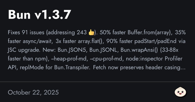 Bun v1.3.7 fixes 91 issues and delivers major performance improvements: 50% faster Buffer.from(array), 35% faster async/await, 3x faster array.flat(), and 90% faster padStart/padEnd through a JavaScriptCore upgrade. New features include native JSON5 and JSONL parsers, Bun.wrapAnsi() (33-88x faster than wrap-ansi npm), heap and