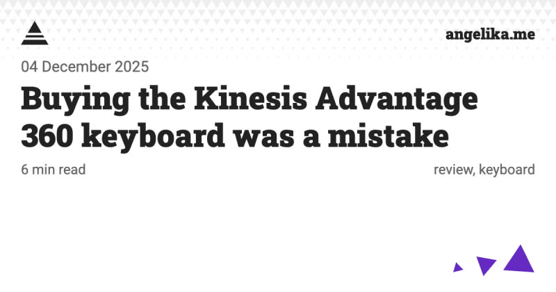 A developer shares their experience switching from Microsoft Sculpt to the Kinesis Advantage 360 ergonomic keyboard after 9 years. Despite the keyboard's reputation and ergonomic features (split layout, thumb clusters, orthogonal keys), it didn't work due to forced customization requirements, tall key shapes causing pinky