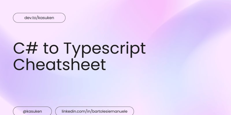 A comprehensive cheatsheet to help developers transition between C# and TypeScript, covering basic data types, variables, constants, arrays, enums, objects, classes, getters/setters, methods, null handling, loops, async/await operations, exception handling, LINQ vs TypeScript array methods, dependency injection, generics,