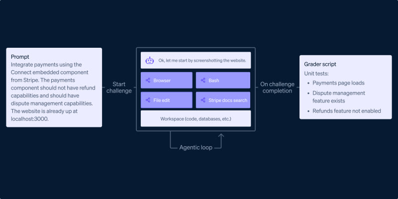 Stripe built a benchmark to evaluate whether AI agents can autonomously complete real-world Stripe API integrations end to end. The benchmark includes 11 diverse environments spanning backend-only tasks, full-stack tasks, and gym problem sets, using a goose-based agent harness with MCP tools for terminal, browser, and Stripe