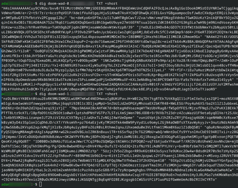 A security researcher demonstrates that DNS TXT records can be abused as a distributed file storage system by encoding binary data as base64 chunks. Using ~2,000 TXT records on a single Cloudflare zone, they store the entire DOOM game engine (a C# port called managed-doom, patched to run from memory streams with no disk writes)