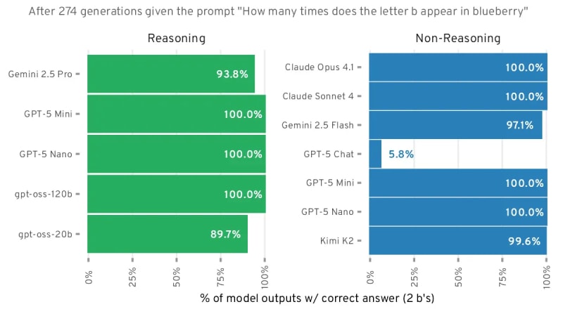 A comprehensive test of modern LLMs reveals surprising inconsistencies in their ability to count letters in words. While most models correctly identify 3 r's in "strawberry" and 2 b's in "blueberry," GPT-5 Chat fails the blueberry test 73% of the time, often confidently claiming there are 3 b's. The study tested multiple models
