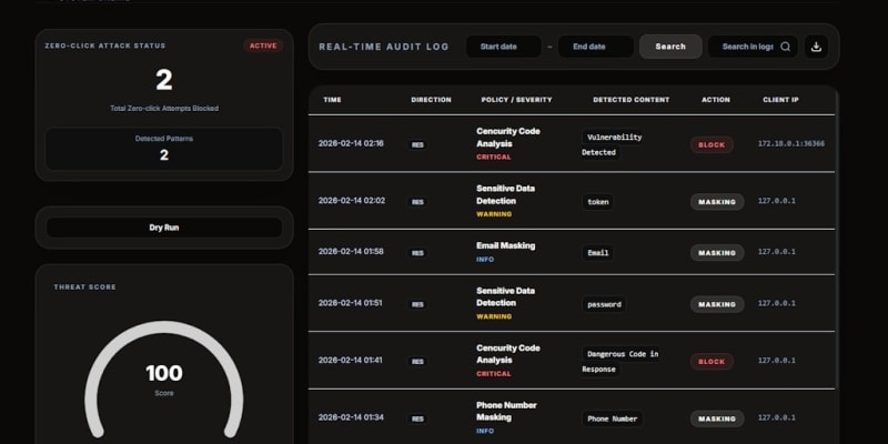 Cencurity is a security gateway that proxies LLM and AI agent traffic to detect, mask, and block sensitive data and risky code patterns in both requests and responses, while maintaining full audit logs of all activity.