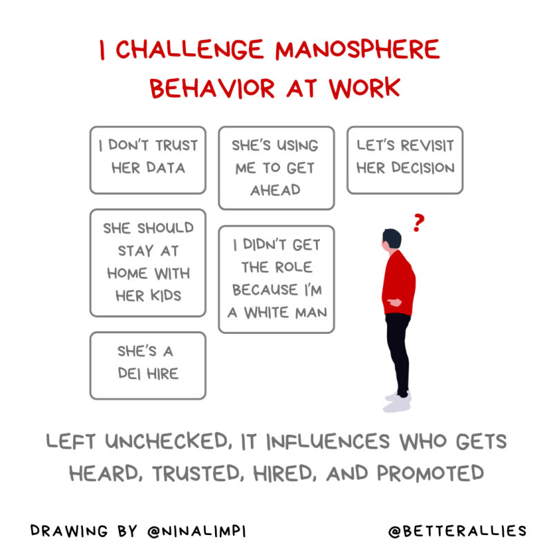 A weekly allyship newsletter covering five actionable steps for creating more inclusive workplaces: challenging manosphere-influenced behaviors at work, decoupling employee self-ratings from manager reviews to reduce bias, advocating for pay equity audits, managing 'compassion collapse' from news overload, and sharing