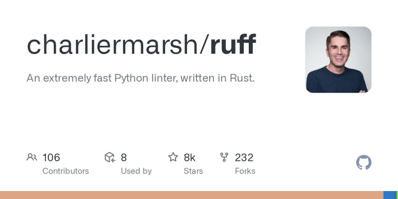 Ruff is an extremely fast Python linter, written in Rust. It can be used to replace Flake8, isort, pydocstyle, yesqa, eradicate, pyupgrade, and autoflake, all while executing tens or hundreds of times faster than any individual tool.