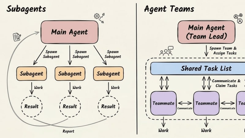 Claude offers two distinct multi-agent paradigms: sub-agents and agent teams. Sub-agents are isolated, fire-and-forget workers that run in their own context windows, report only final results to a parent, and cannot communicate with each other. Agent teams are long-running, collaborative instances with shared state,